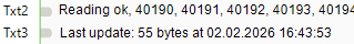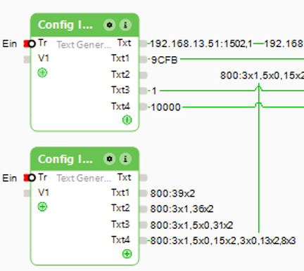 Liest man String-Datentypen aus, so werden diese am Ausgang „Txt2“ des linken Programm-Bausteins gesammelt ausgegeben. Sie dienen ohnehin nur zur Info und so viele Textausgänge gäbe es auch gar nicht.