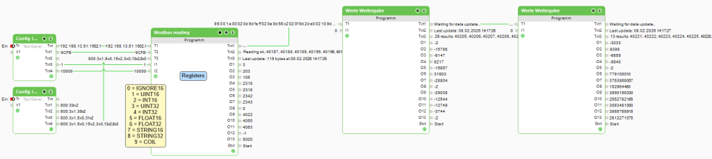 - Zunächst sieht man oben links im Bild zwei Textgenerator-Bausteine, welche die Konfiguration zum Lesen von Registern enthalten. Darauf wird gleich eingegangen.