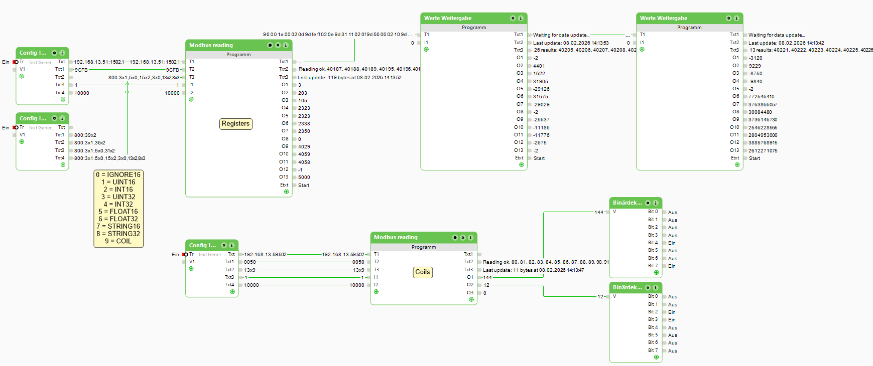 Generell werden drei verschiedene Arten des Auslesens unterstützt: Numerische Datentypen, Strings und Coils (also Bit-Register). Zu jede dieser Arten findet sich dann gleich ein Beispiel. Die unterstützten Datentypen sind im Detail: