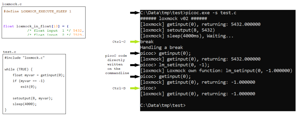 Wird der Code nun ausgeführt (picoc.exe -s myscript.c) und der Loxmock wurde nicht konfiguriert, so liefert getinput(0) immer den Wert 0 zurück(Endlosschleife) und bei den sleep()-Statements wird auch nicht gewartet.